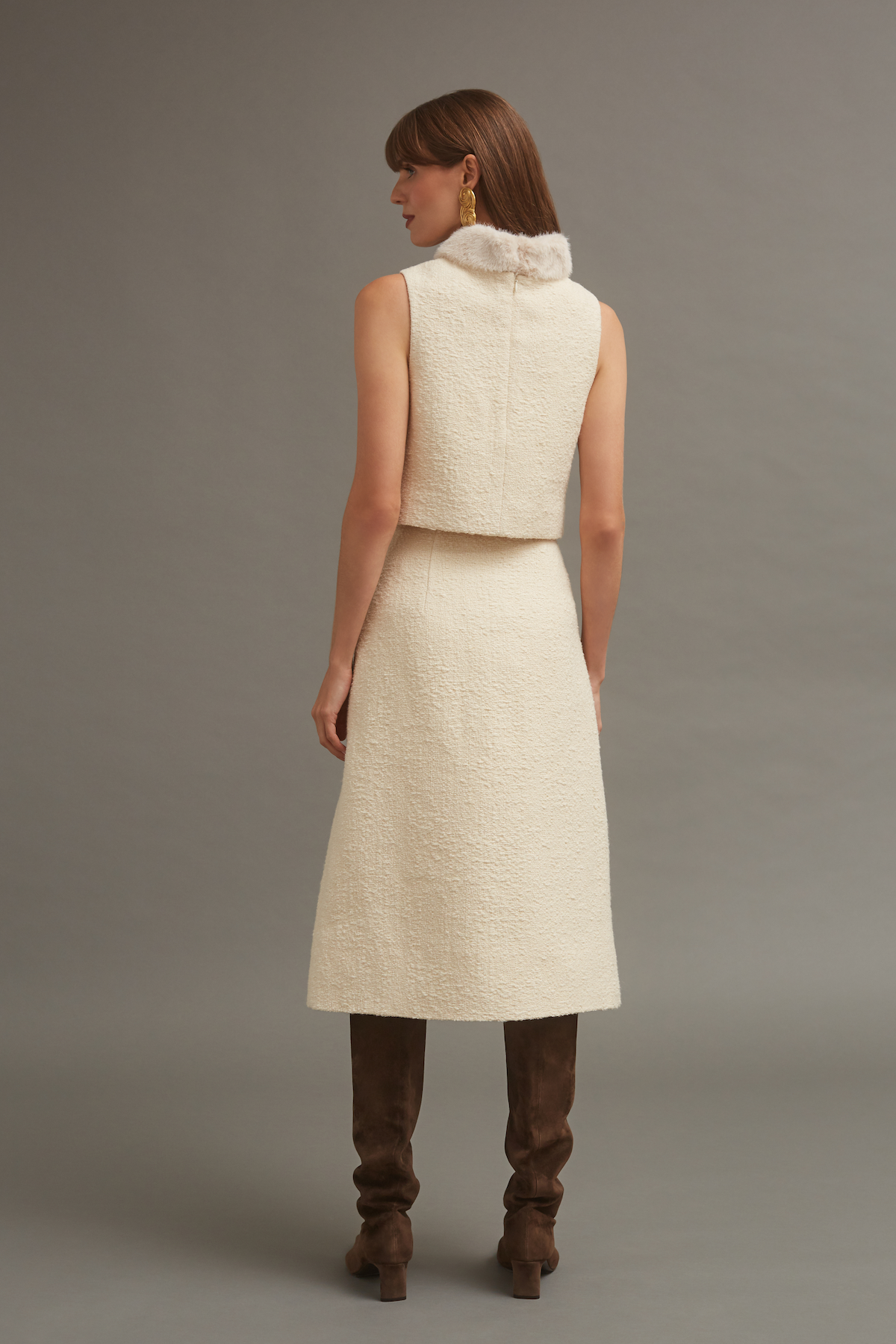 • Wrap Italian boucle midi skirt with gold novelty buttons at front and metal snaps on interior