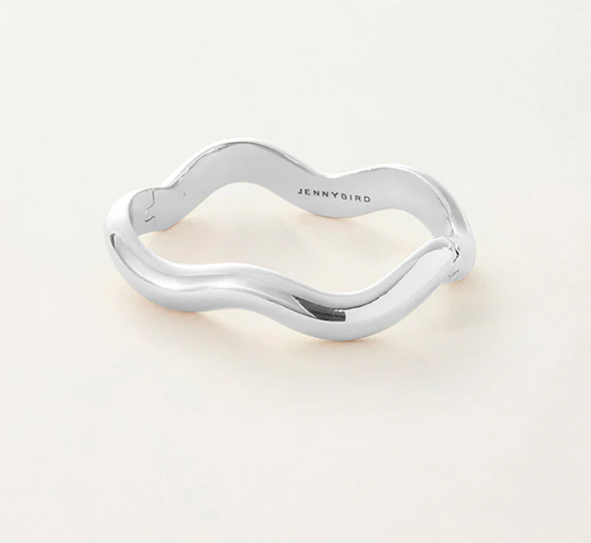 the curves, stack with another Ola Bangle, or mix in a silver version for a two-tone effect. This high polish bangle opens and closes with a hinge and tab lock closure. To open, push down on the highest point of the clasp before pulling the bangle open. To close, listen for a "click" to ensure tab is locked properly. Note: this design wears best when the closure is secured on the inside of your wrist. Finished in high-polish silver.
