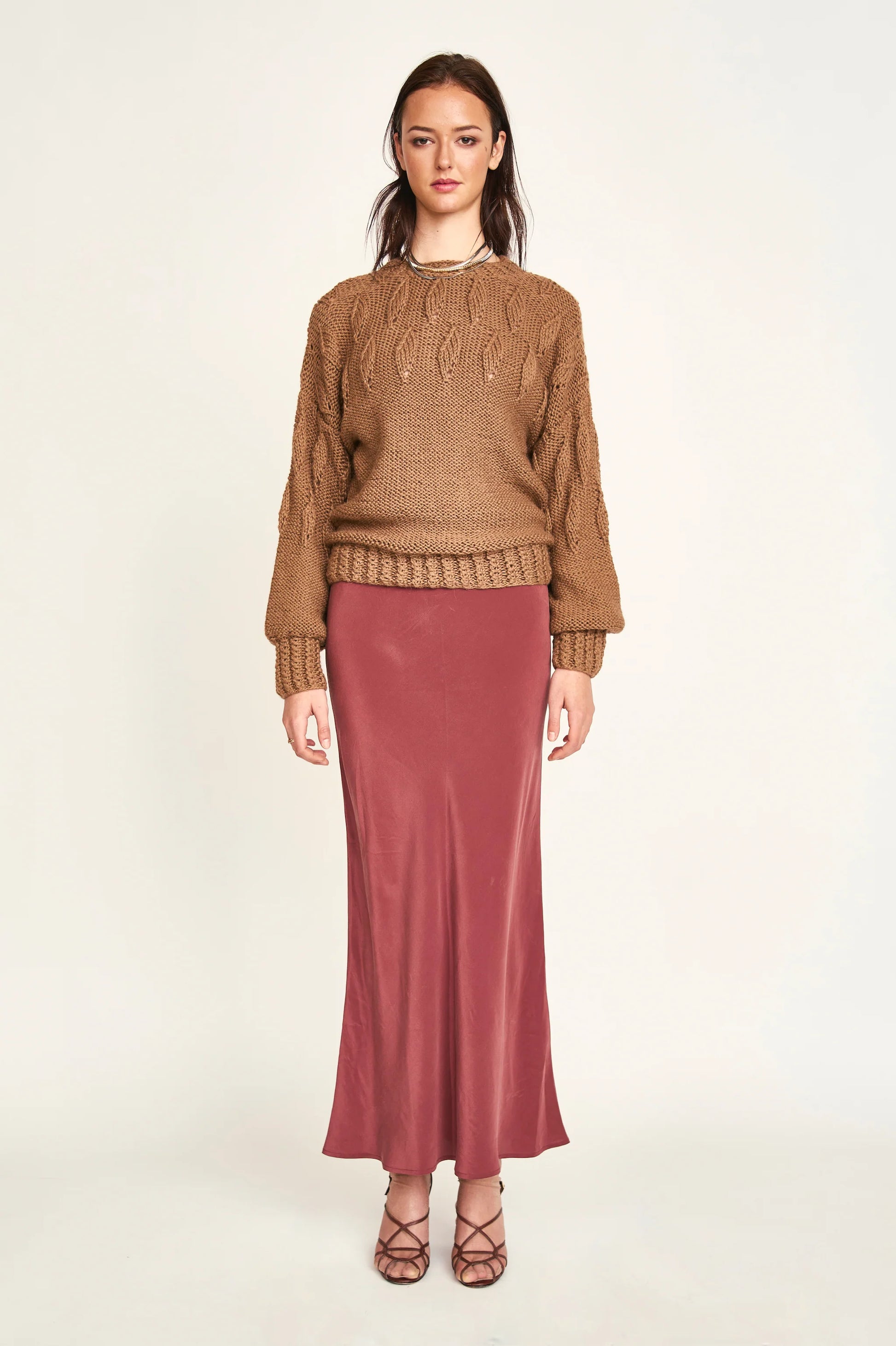 Slim fit elastic waist silk maxi skirt with an encased elastic waist.