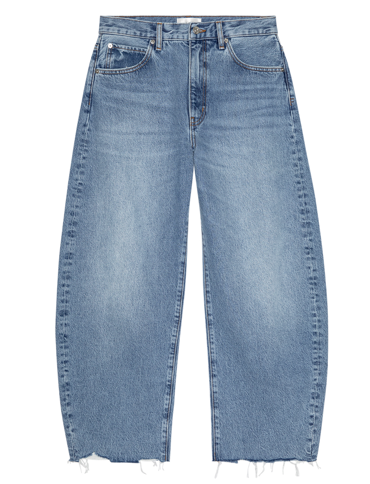 The best-selling Bubble, now with a shorter 27" inseam. The exaggerated take on the trending barrel silhouette is a unique fit and instant closet necessity. With a flattering high rise, these jeans have a curved outseam for a playful bubble effect. Note the light blue wash and raw, fringed hem for a pre-loved look.